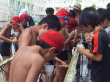 本校のおやじの会の皆さんが、子ども達に夏休みの思い出にと、「水泳大会と流しそうめん」をしてくださいました。暑い一日でしたが、2日前の37度の時とは、違って風もあり、気温も33度とちょうどよい天候でした。流しそうめんは、子ども達に大好評で、予想以上の食いっぷりにおやじの会の方々もビックリ。水泳大会では、ボールを運んだり、歩いたり泳いだり、プールでの一日を満喫しました。